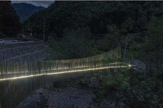 最終,在余姚中村小溪上架起的這座竹橋,僅花了 2.6 萬,其中 2.1 萬人工費,5000 元材料費。它造價低廉卻質樸優美,僅有 1.2 米的橋身剛好是足夠一人走、另一個人側身而過的尺度,到了晚上,小橋上安裝的燈帶散發著微光,為它增添了一分別樣的美感。